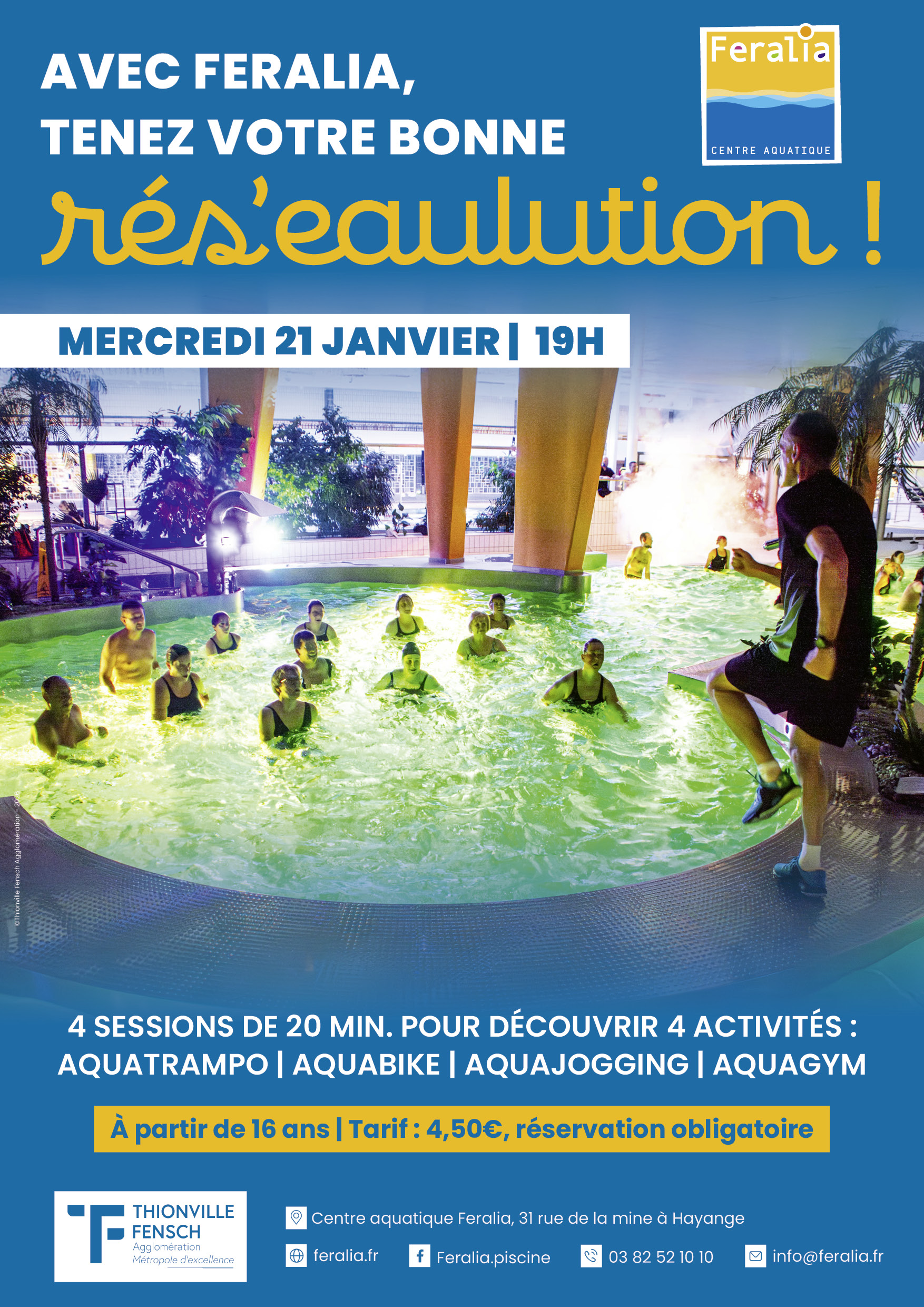 Pour démarrer 2026 avec énergie et bonne humeur, le centre aquatique Feralia vous propose une soirée unique pour découvrir 4 activités phares de la piscine : l'aquagym, l'aquabike, l'aquatrampo et l'aquajogging (attention : être à l'aise dans le grand bassin). Chaque atelier dure 20 minutes, l'occasion idéale pour tester et trouver l'activité qui boostera votre année !