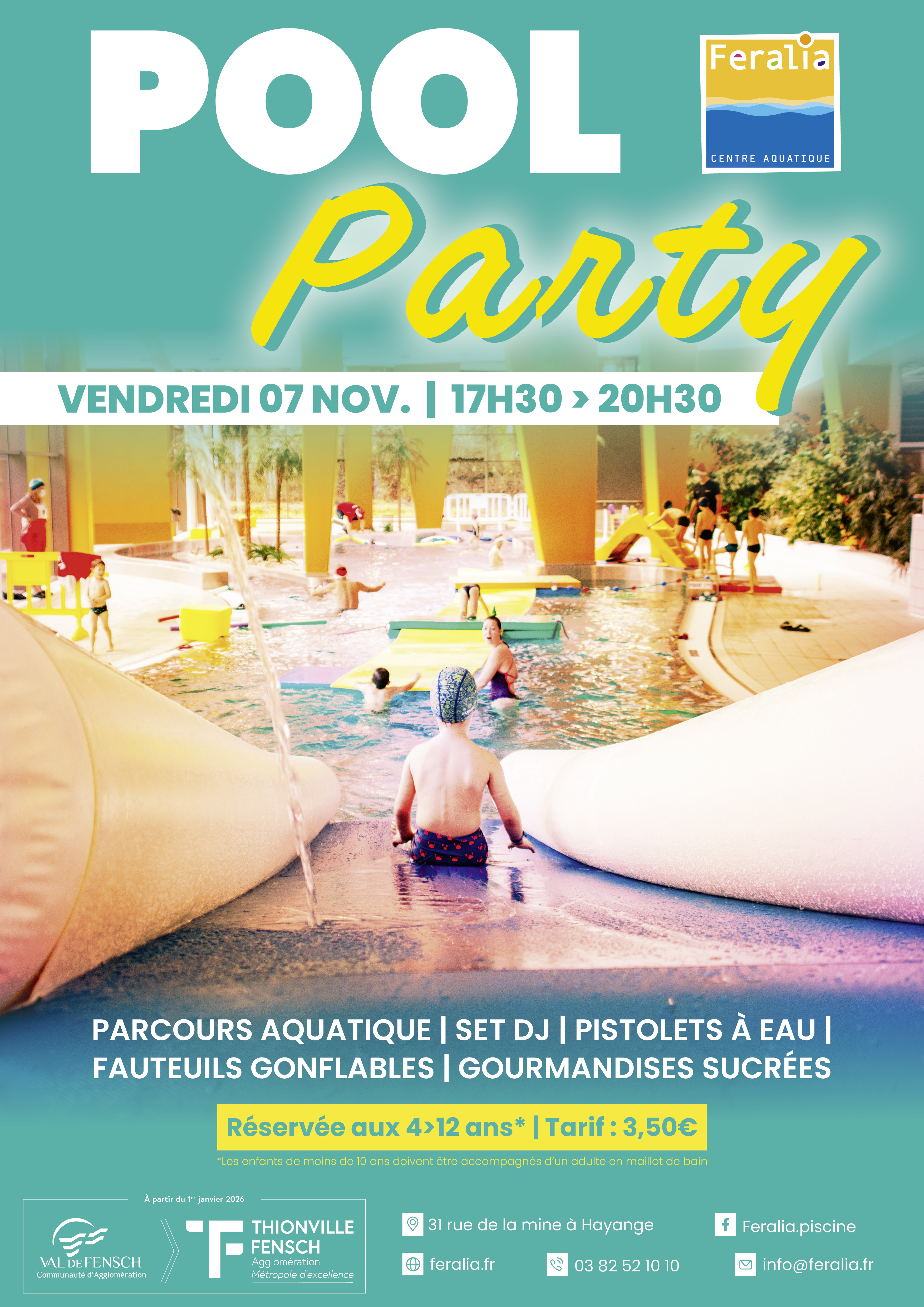 Le vendredi 07 novembre, le centre aquatique Feralia organise une pool party, réservée aux enfants de 4 à 12 ans.